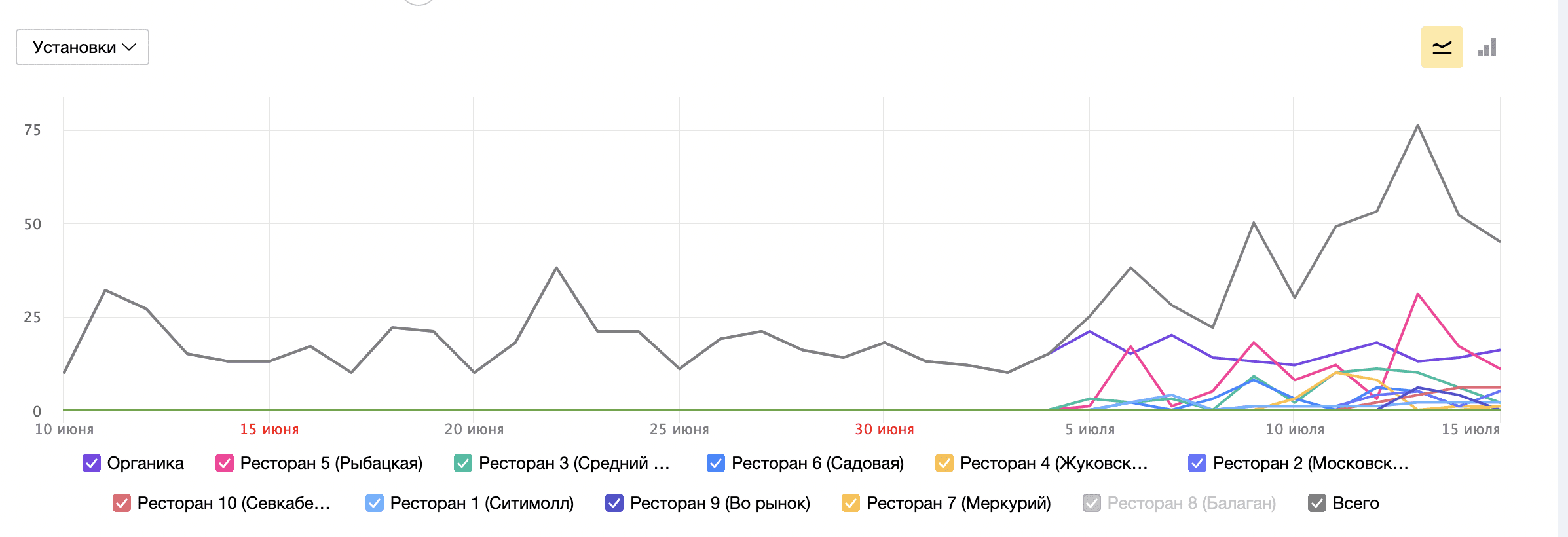 В AppMetrica можно отслеживать, сколько установок было в каждом заведении, и выявлять победителей.