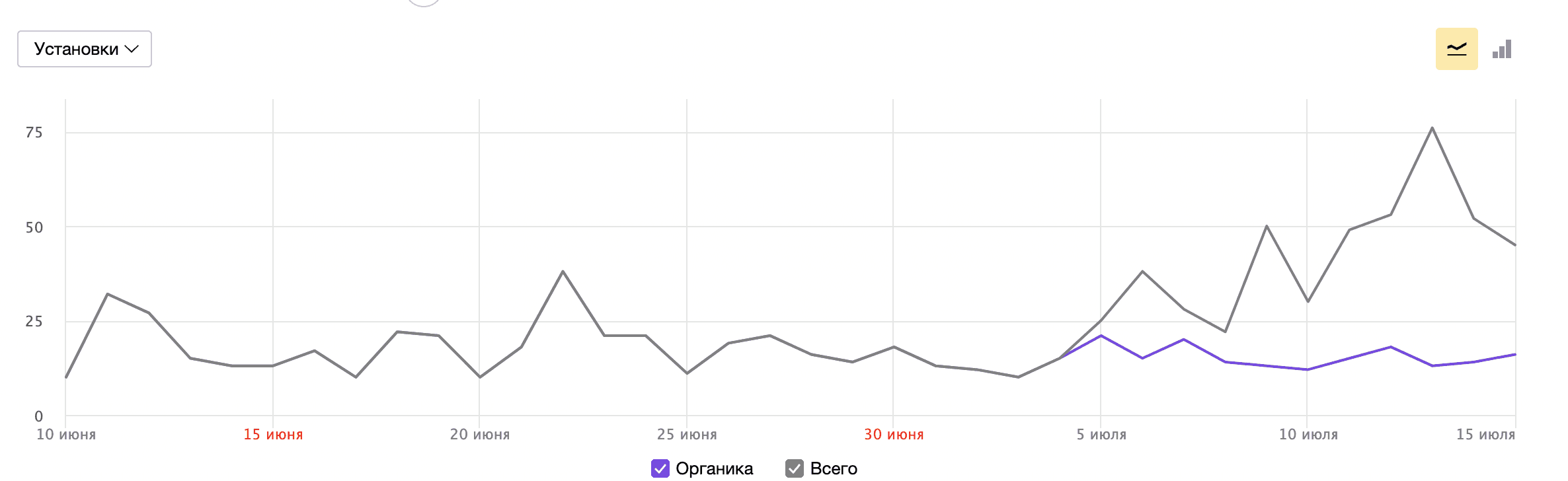 Фиолетовая линия — органические скачивания приложения. Все, что выше — работа персонала