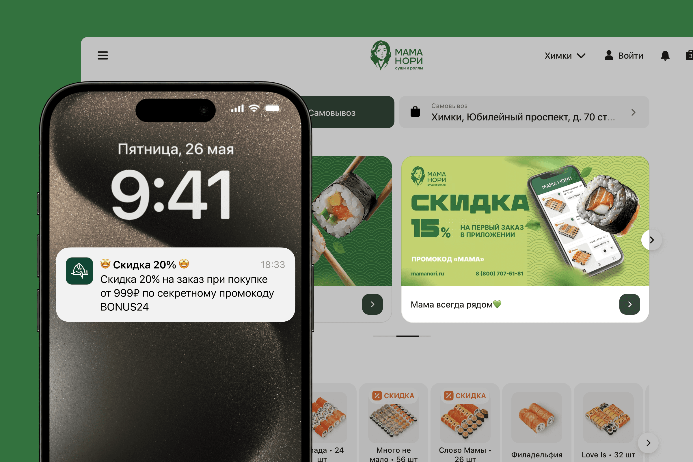 «Мама Нори» активно привлекает и удерживает гостей. VK-блогеры ведут голодных подписчиков на сайт, где их ждёт скидка 15% на первый заказ через приложение. Пуш-рассылки с акциями и триггерные напоминания о баллах помогают превращать новых клиентов в постоянных.