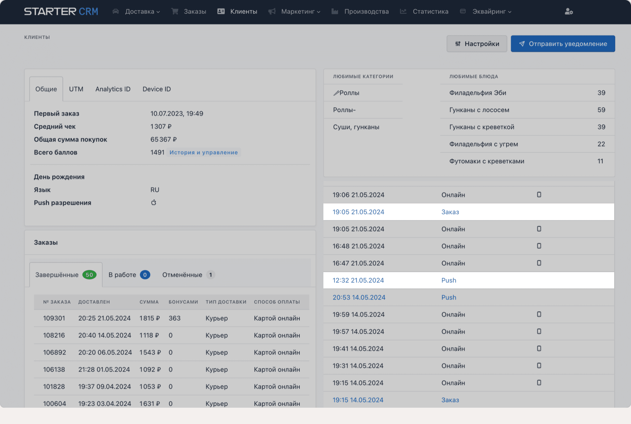 Пример ниже: в 12:32 улетел пуш. В 19:05 прилетел заказ. Так это работает. Кстати, это был 50-й заказ гостя!
