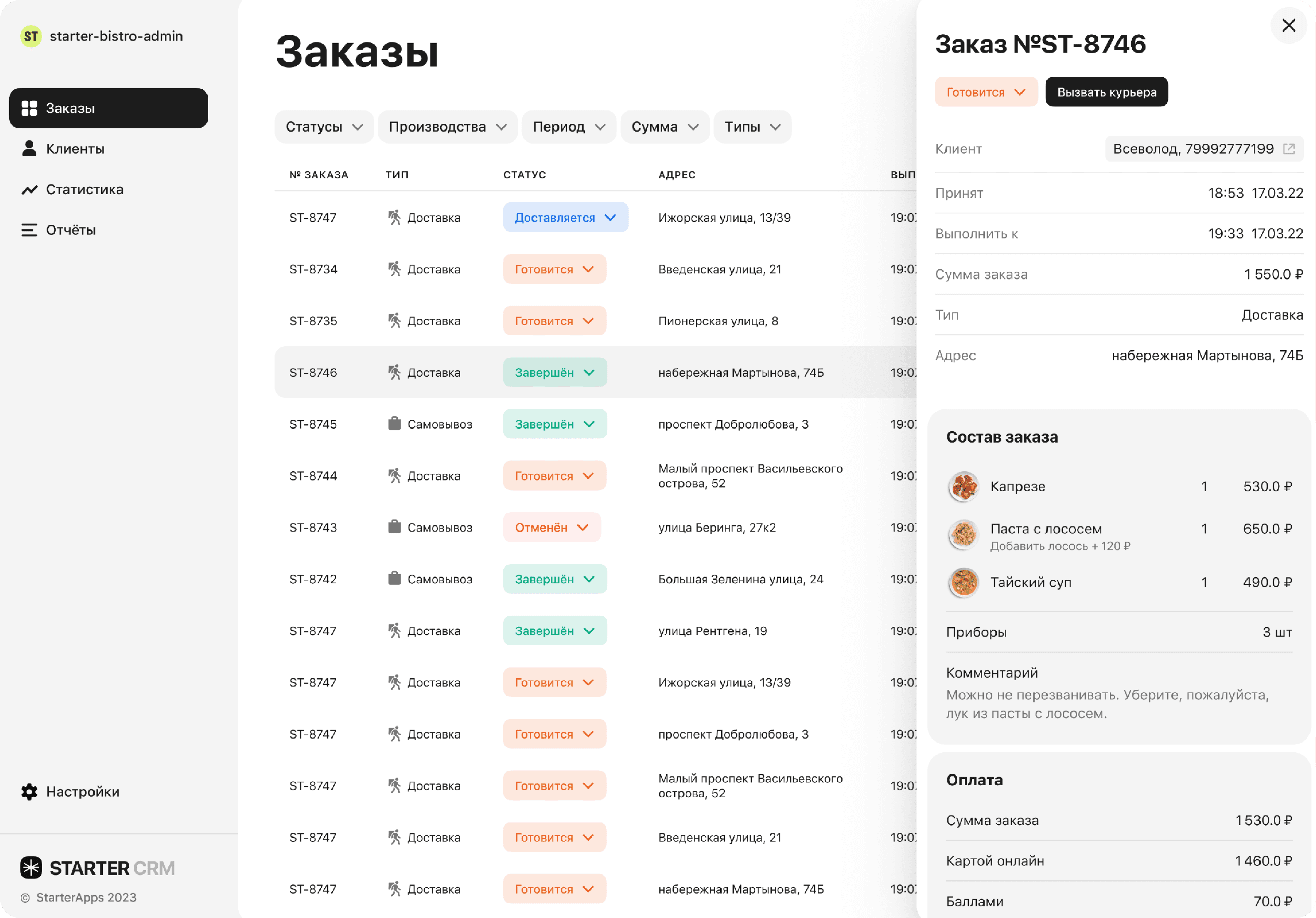 Стартер интегрирован со службами доставки и умеет вызывать курьера автоматически